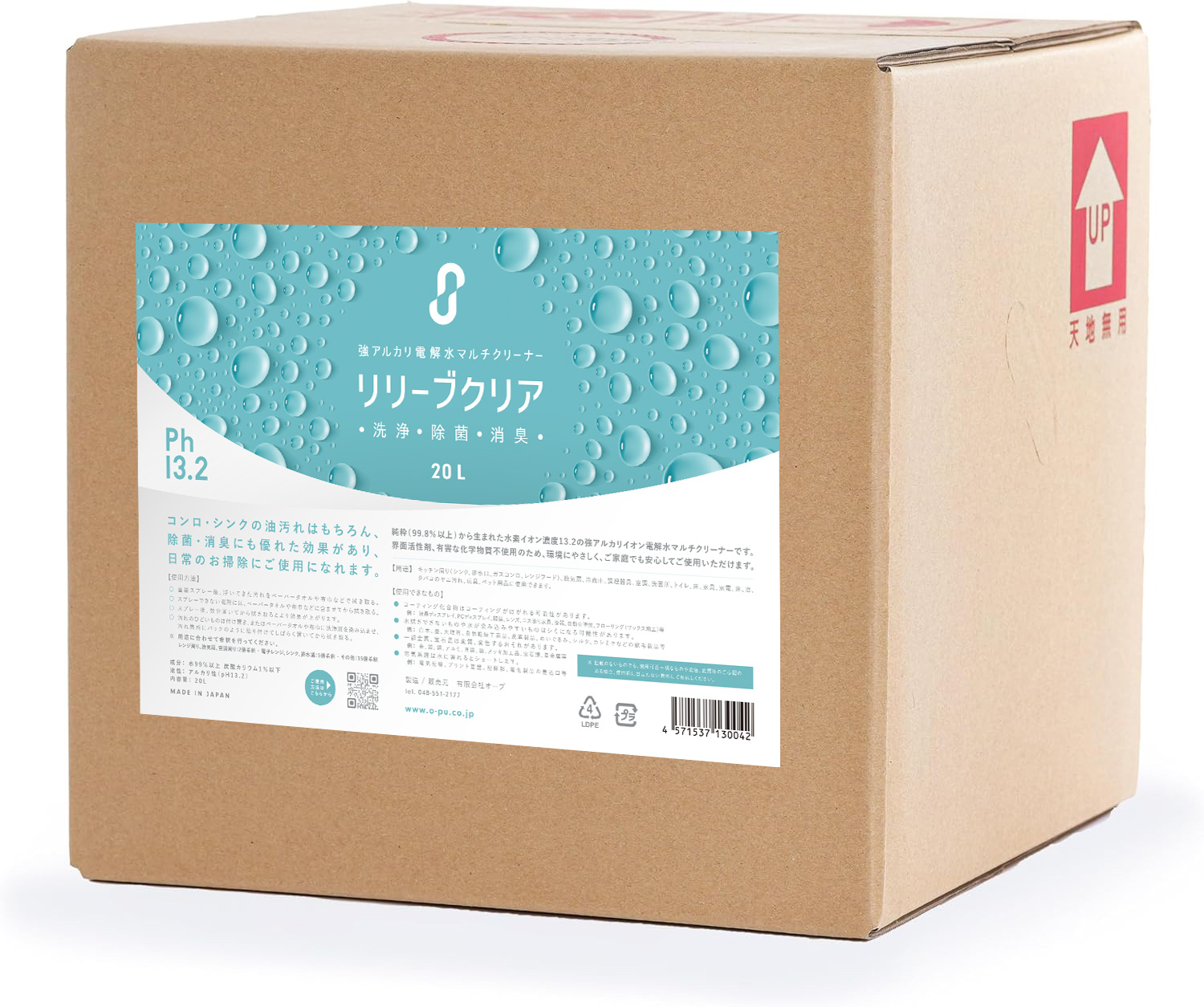 本製品は、炭酸カリウムを電解質として添加し、独自の生成技術により生成した水素イオン濃度pH13.2の強アルカリ水です。油脂・皮脂などの主にベタベタとしている酸性の汚れに対してアルカリ性が浸透し、洗浄・除菌・消臭の効果があります。